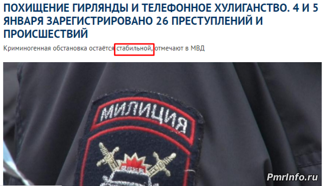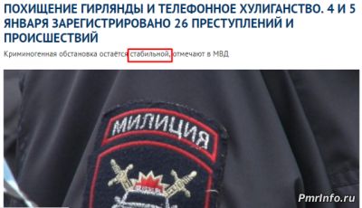 | По заявлениям правительства, различных государственных структур, в частности МВД ПМР и информационных как интернет новостных ресурсов так и СМИ Приднестровья сообщают о постоянных положительных тенденциях развития Республики, её развития и стабильности. Всё это конечно хорошо, но какого реальное положение вещей в ПМР. Хотелось бы узнать мнение жителей Приднестровья. Лично я стабильность ощущаю только в росте курса валюты, росте цен на продукты питания и другие товары, а вот роста зарплат я не наблюдаю к примеру. Из чего и следует вопрос, а в чём заключается стабильность в Приднестровье?
